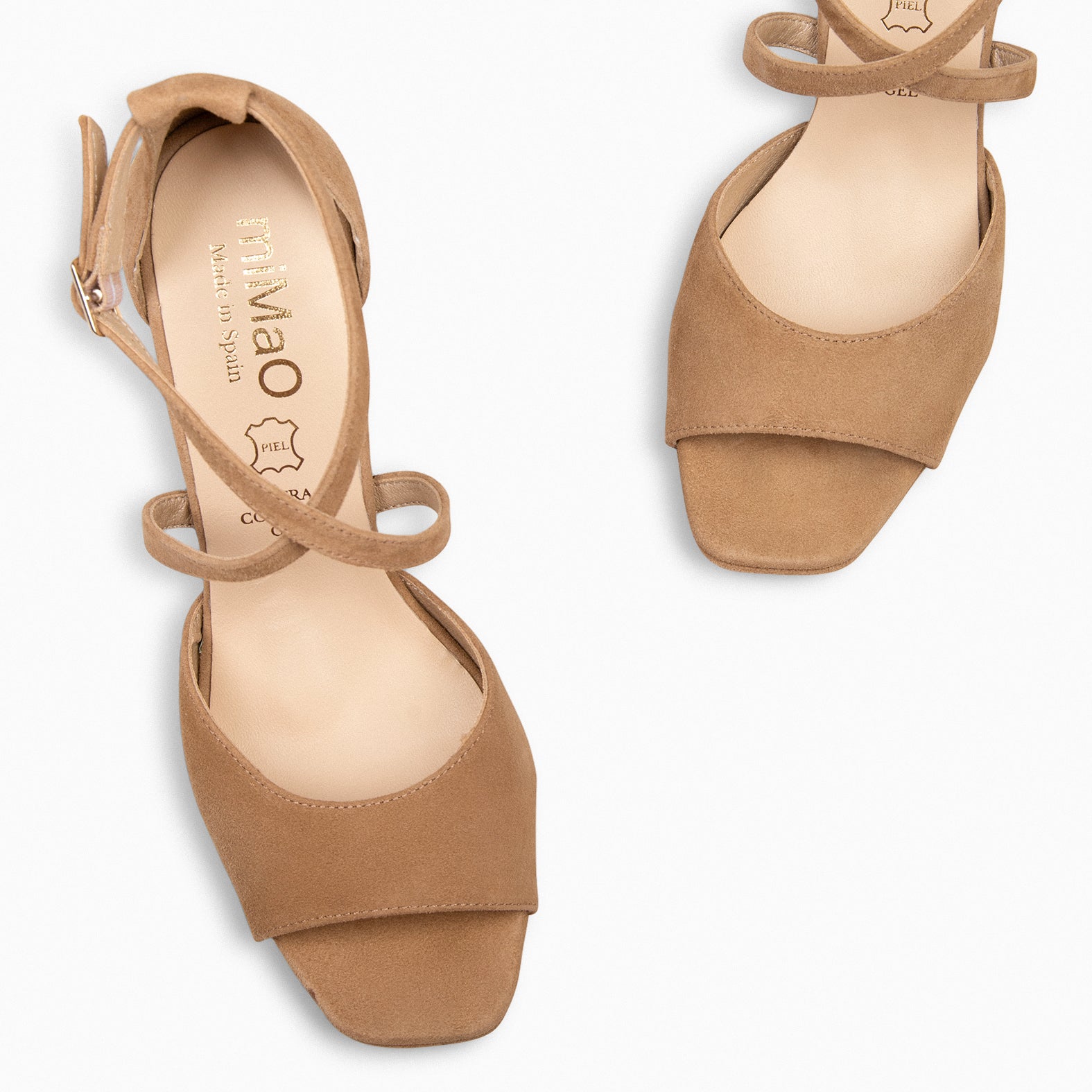 Impresionante sandalia de fiesta para mujer en color camel. Con una exquisita combinación de diseño y comodidad, esta sandalia es el complemento perfecto para tus ocasiones especiales, siendo su material principal el ante. Sus tiras cruzadas forman un hermoso patrón sobre tu empeine, añadiendo un toque de sofisticación a tu look.