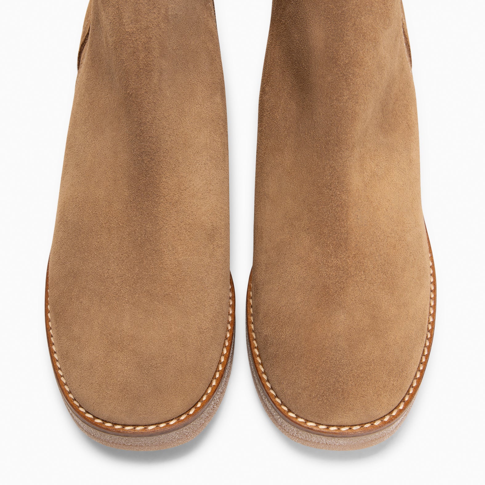 También incorporan un elástico lateral tipo chelsea, una cremallera lateral que facilita el calce y descalce, y una suela exterior antideslizante de crêpe.