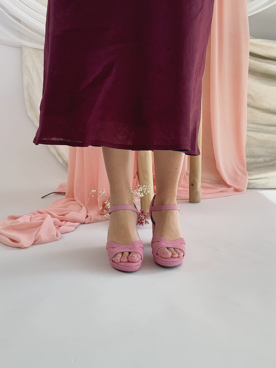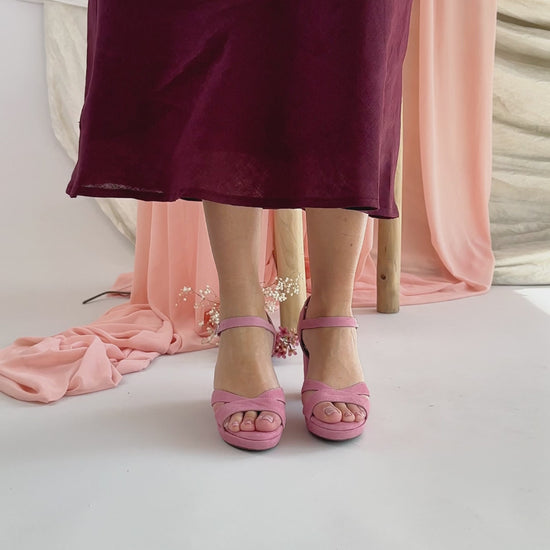 Sandalias de tacón alto y plataforma ideales para llevar en ocasiones especiales. Están hechas en ante, perfecto para combinar con vestidos elegantes o con ropa más informal.