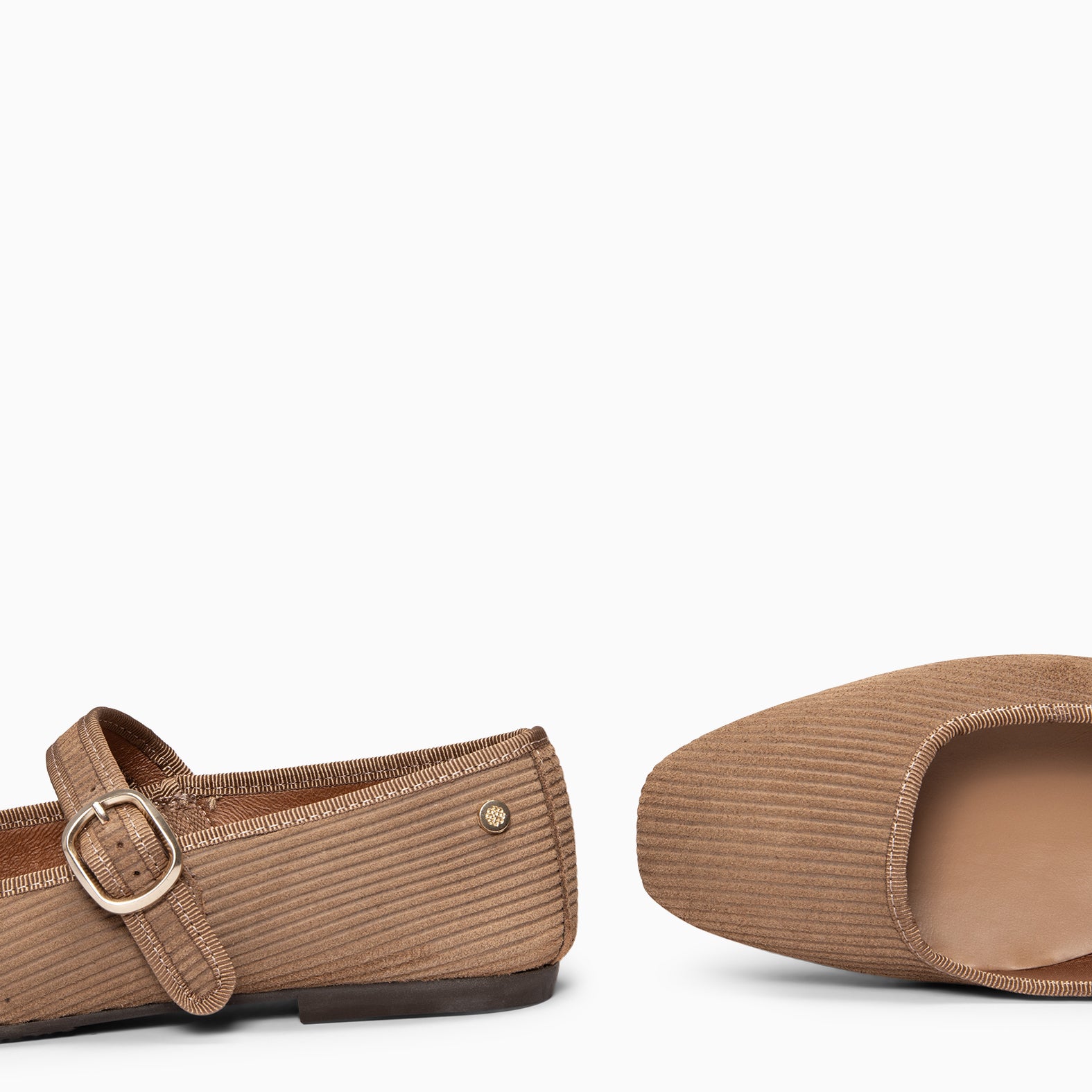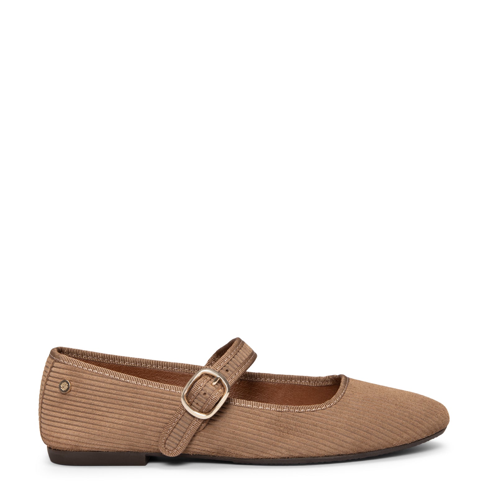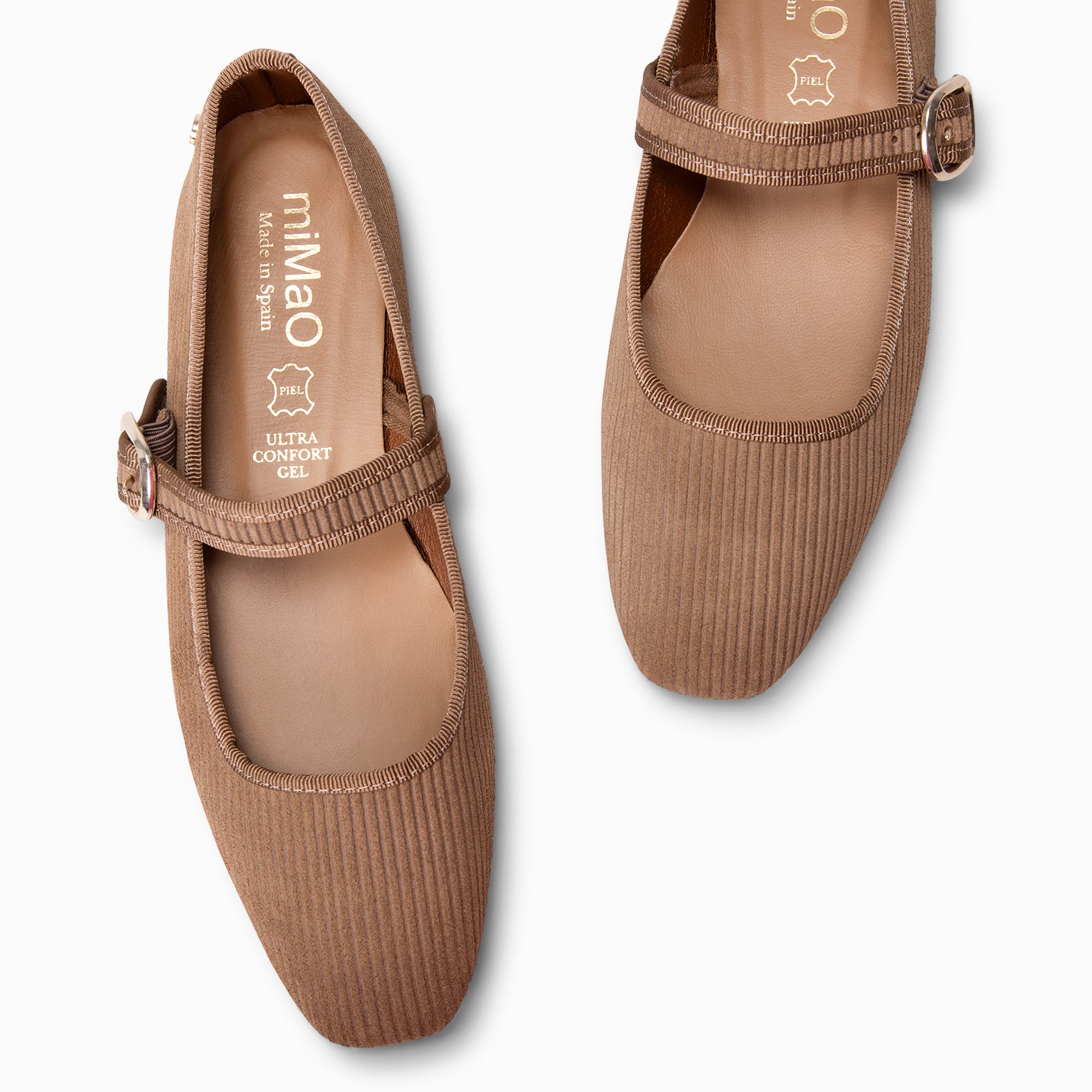 Esta Mercedita está fabricada en piel de serraje de pana, tiene una altura de tacón de 1 cm. Además, cuenta con una tira para poderla ajustarla a tú medida, también cuenta con una hebilla que tiene elástico para mejor puesta.