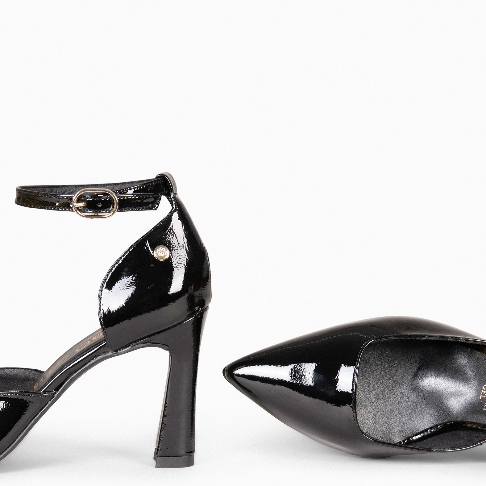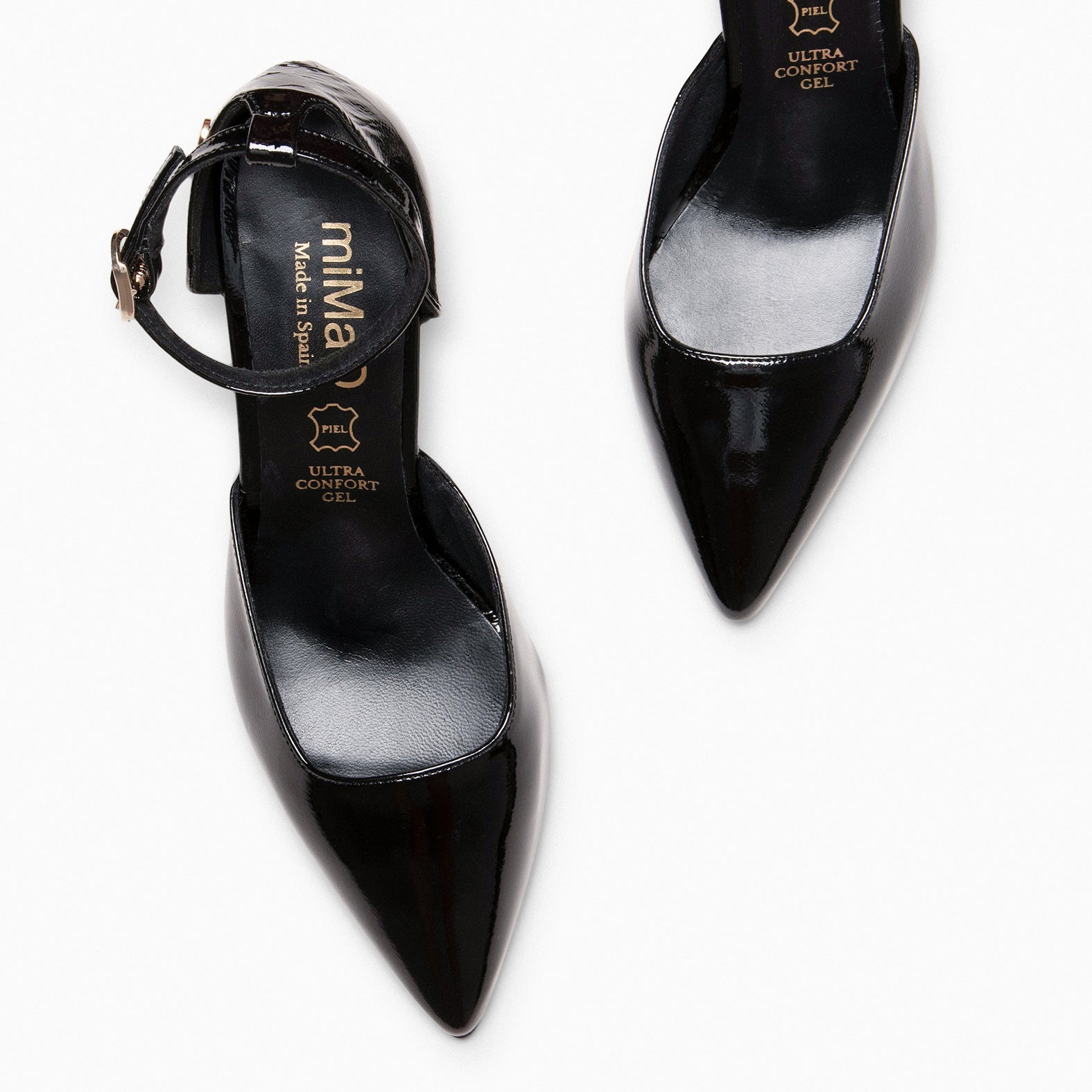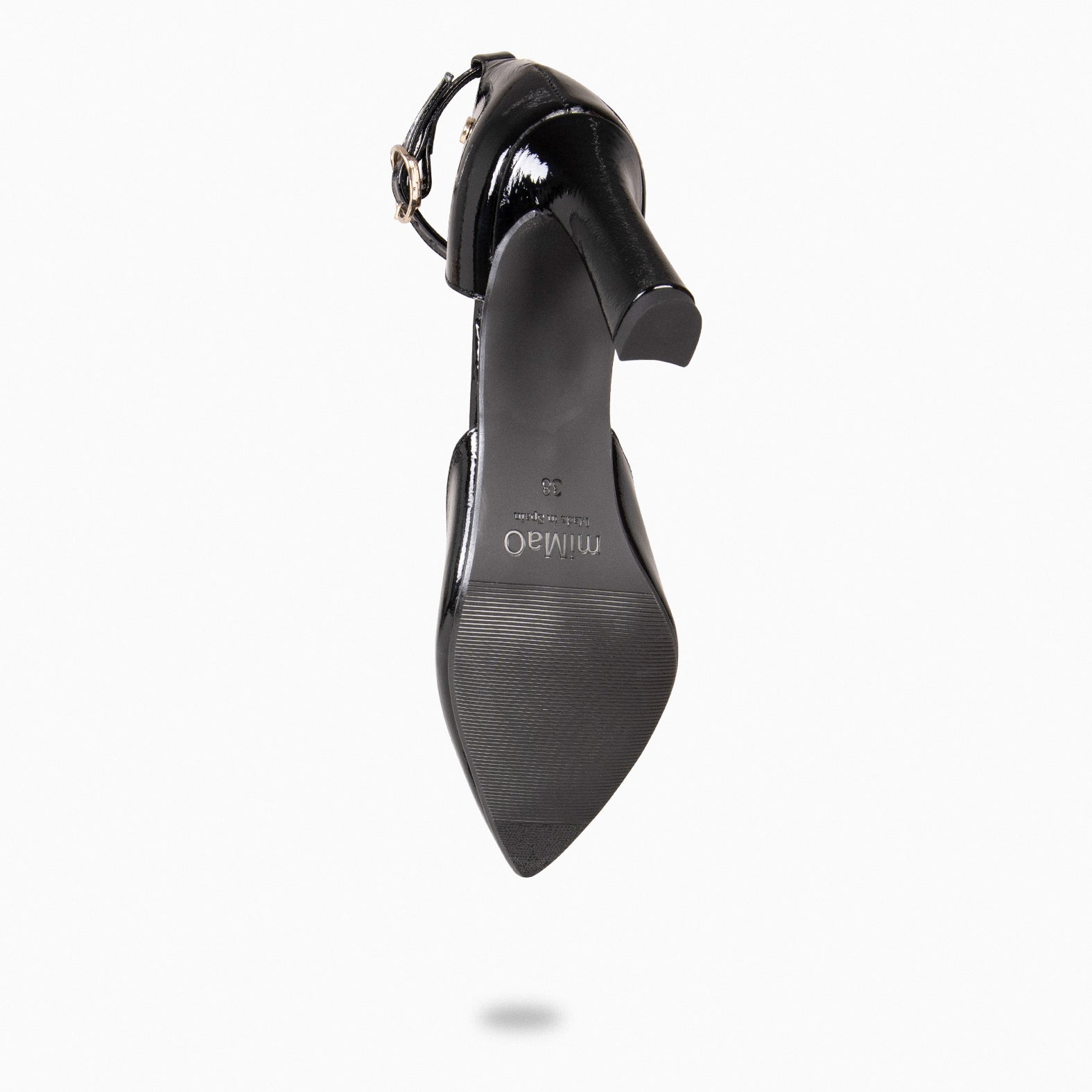 La talonera adornada con una pulsera y hebilla ovalada dorada no solo añade un toque de glamour, sino que también garantiza un ajuste seguro y cómodo al tobillo. Cuenta con una tacha dorada, en el lateral exterior, de la marca miMaO. Con un tacón de 9 cm de altura y una suela de 0,5 cm, estos zapatos proporcionan la altura ideal sin comprometer la estabilidad.