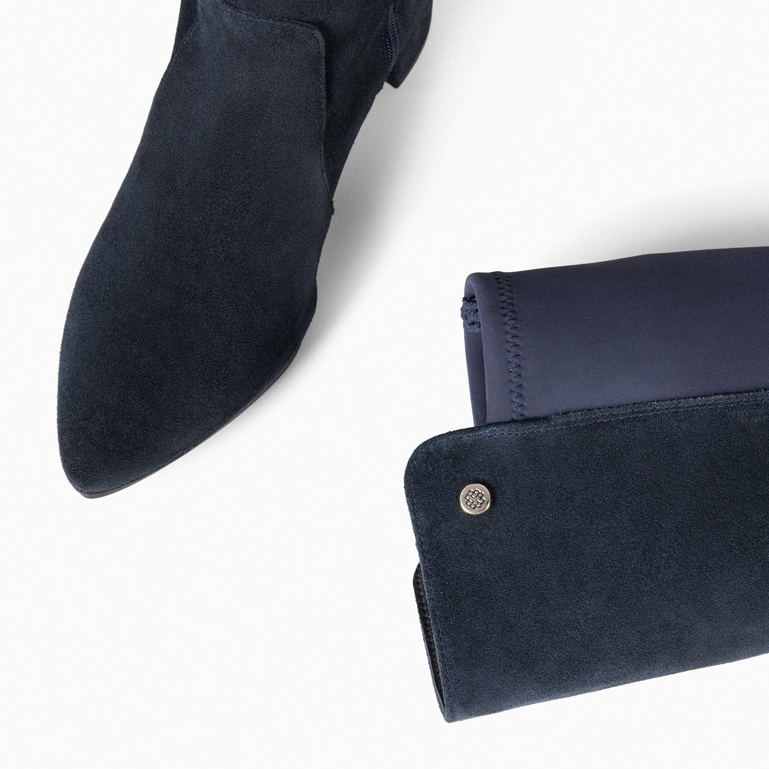 Estas botas están fabricadas en piel de serraje y lycra en la parte trasera que se ajustará perfectamente a tu pierna. Unas botas elegantes con puntera fina y tacón ancho de 6,5 cm de altura, que aportará toda la estabilidad que necesitas en cada uno de tus pasos. Además, la plantilla de piel Ultra Confort Gel hará que sean tus botas de tacón más cómodas.