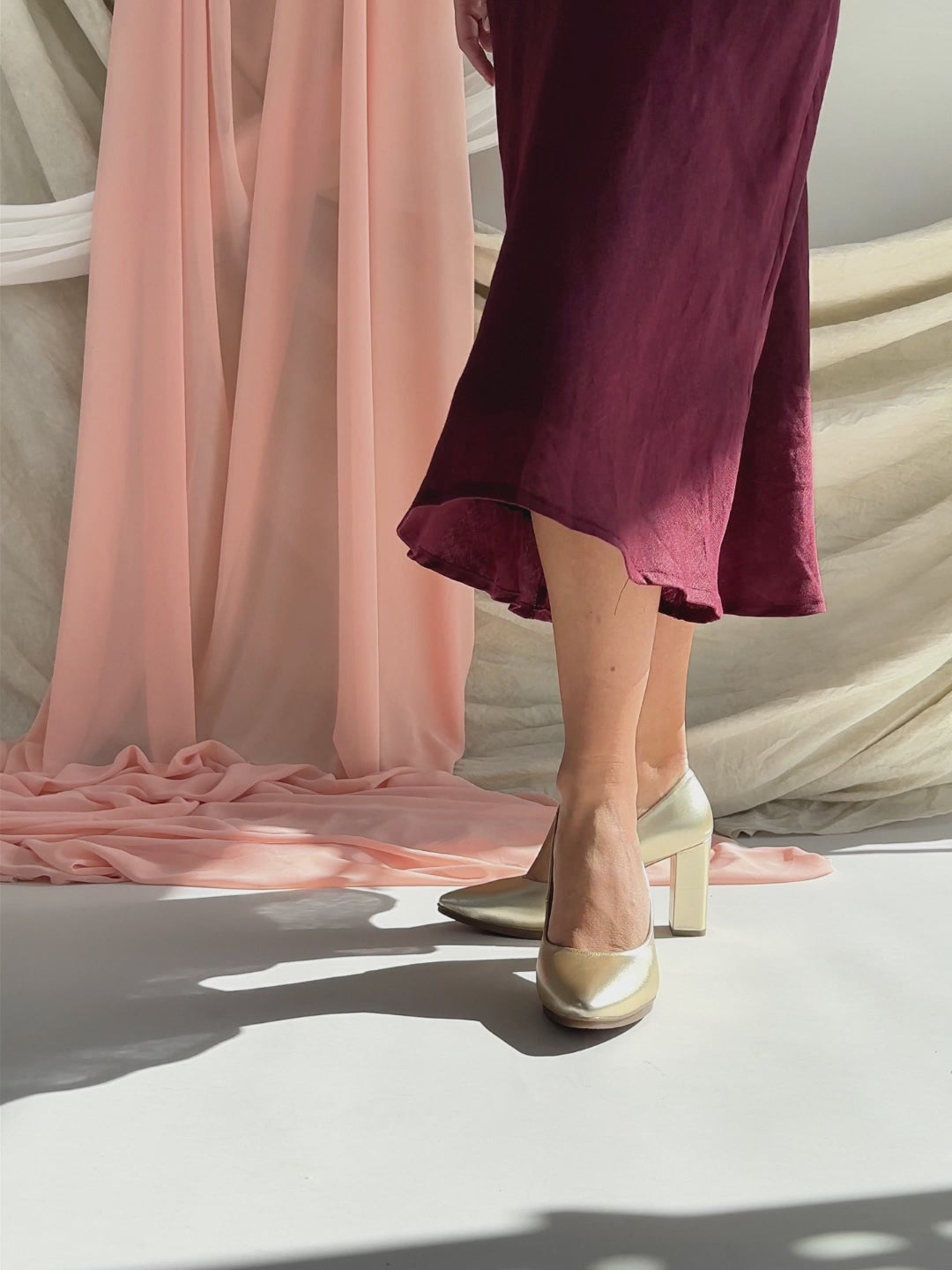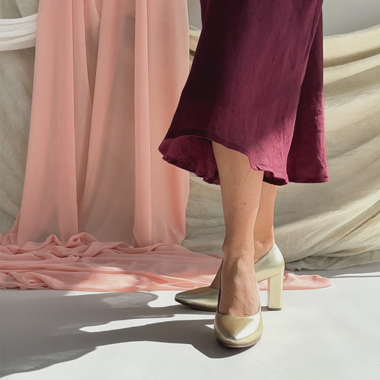 Zapatos de tacón con un acabado metalizado perfecto para completar tu armario con una línea de tonos metálicos. Son ideales para usar en ocasiones especiales gracias a su altura de 8,5 cm, pensada para estilizar la pierna. El tacón del zapato es alto (8,5 cm) pero su base es ancha y garantiza estabilidad. El diseño de la puntera recoge los dedos y el forro interior es muy suave.