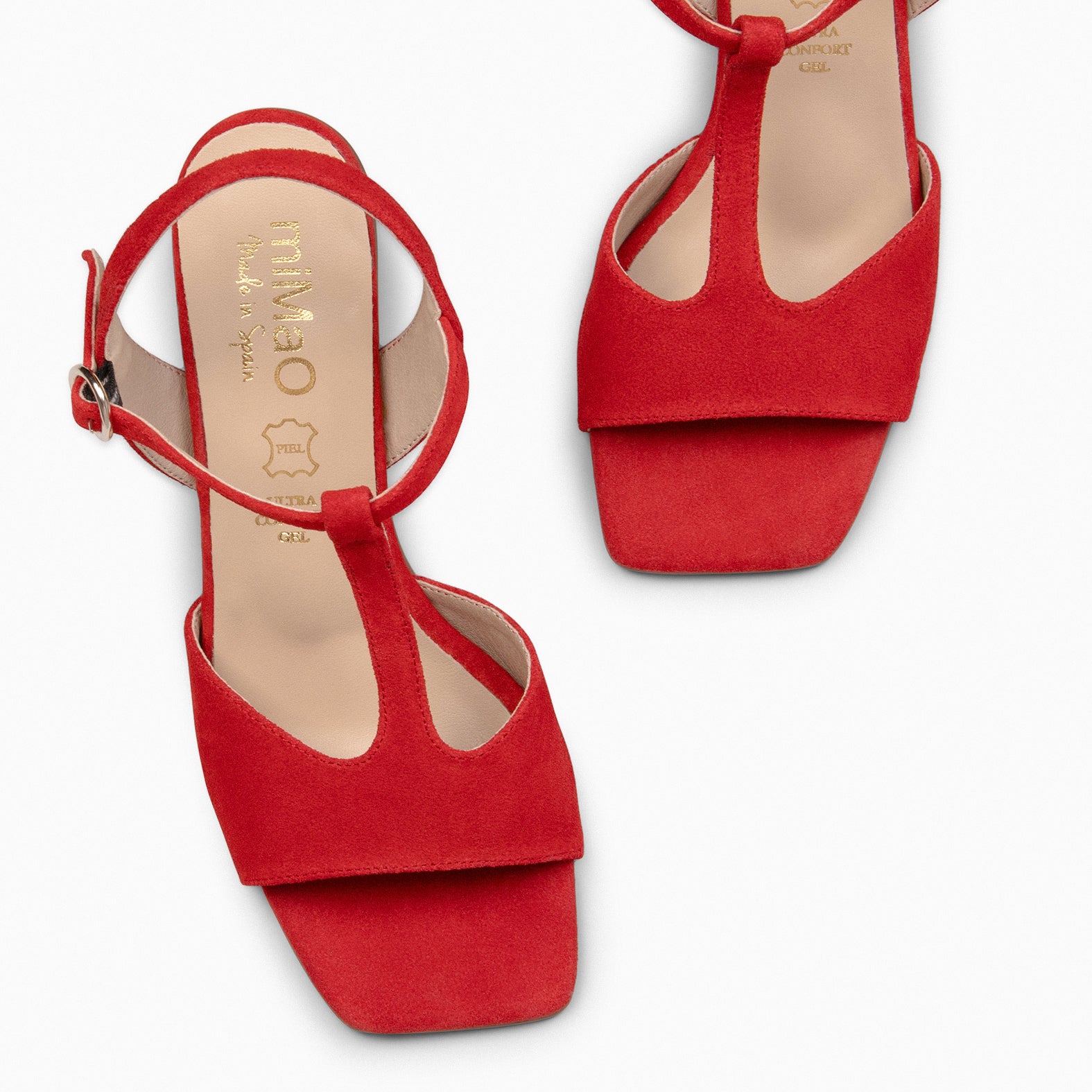 Esta sandalia de tacón alto de 7 cm y color rojo es una combinación perfecta de estilo y comodidad para cualquier ocasión. Su diseño presenta una hermosa pala abierta que deja los dedos al aire, agregando un toque de elegancia y feminidad. Una tira recorre el empeine del pie, conectando la pala con las tiras traseras y creando un escote dividido en dos, que realza la silueta del pie de manera encantadora. La puntera cuadrada añade un toque moderno y distintivo al diseño.