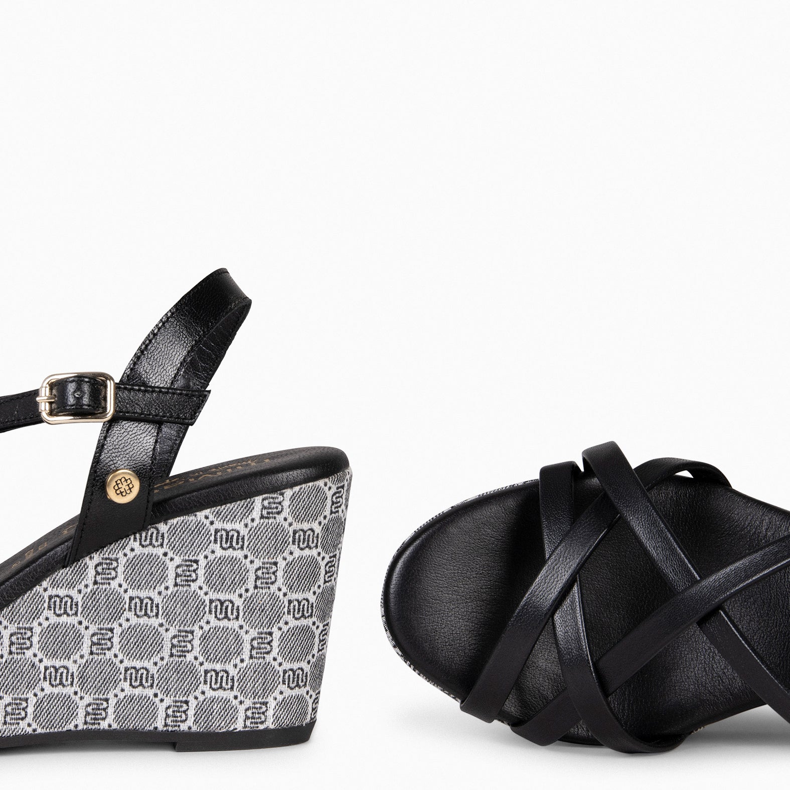Estas sandalias de cuña para mujer en color Negro son una verdadera declaración de estilo y comodidad. El tejido jacquard personalizado con el logotipo de miMaO que rodea toda la cuña añade un toque exclusivo y distintivo a este calzado.