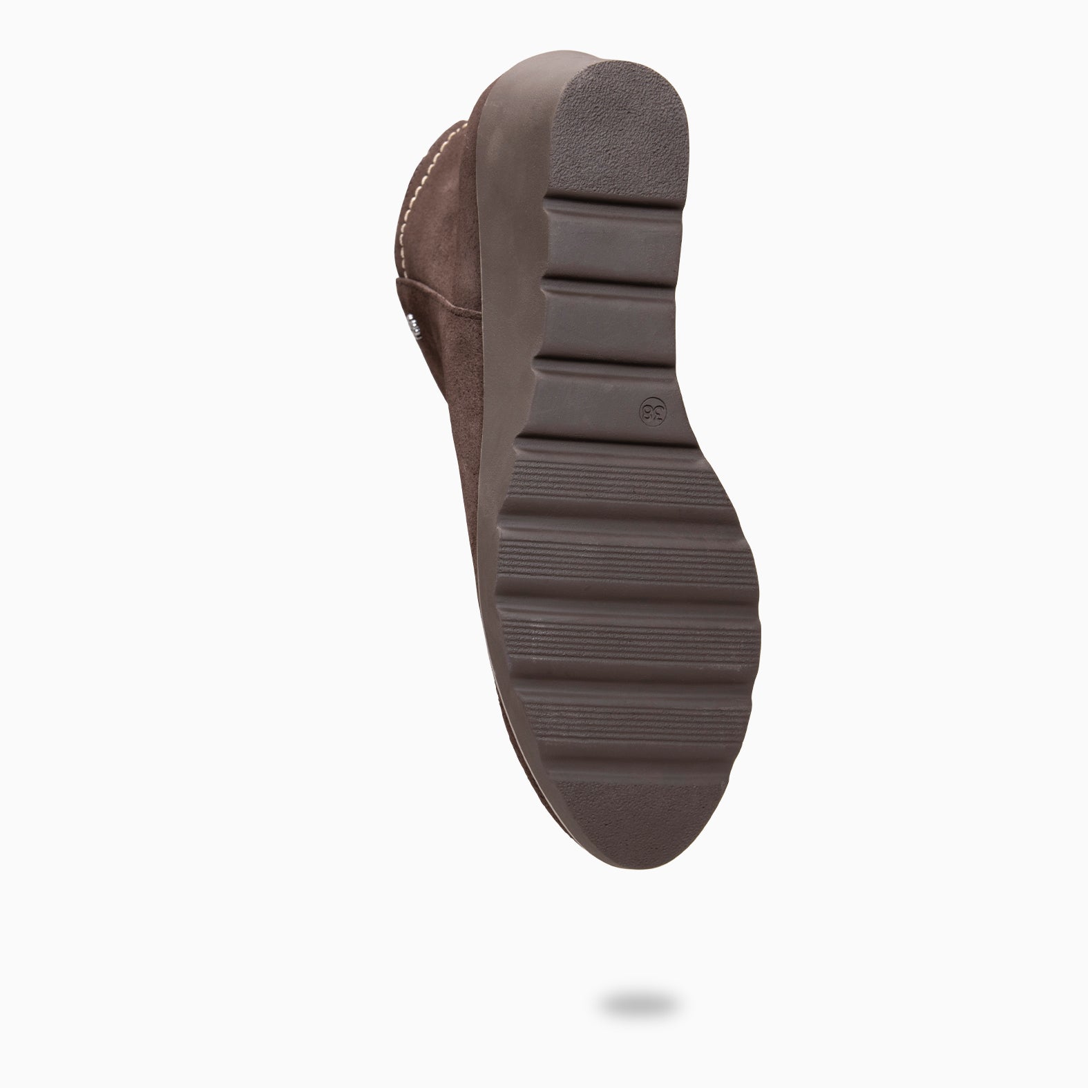 El botín está fabricado en piel de serraje hidrófugo, está piel repele el agua y evita que cale y moje tus pies. Tiene una altura de 5cm y cuenta con una línea en contraste con el tacón y el botín.