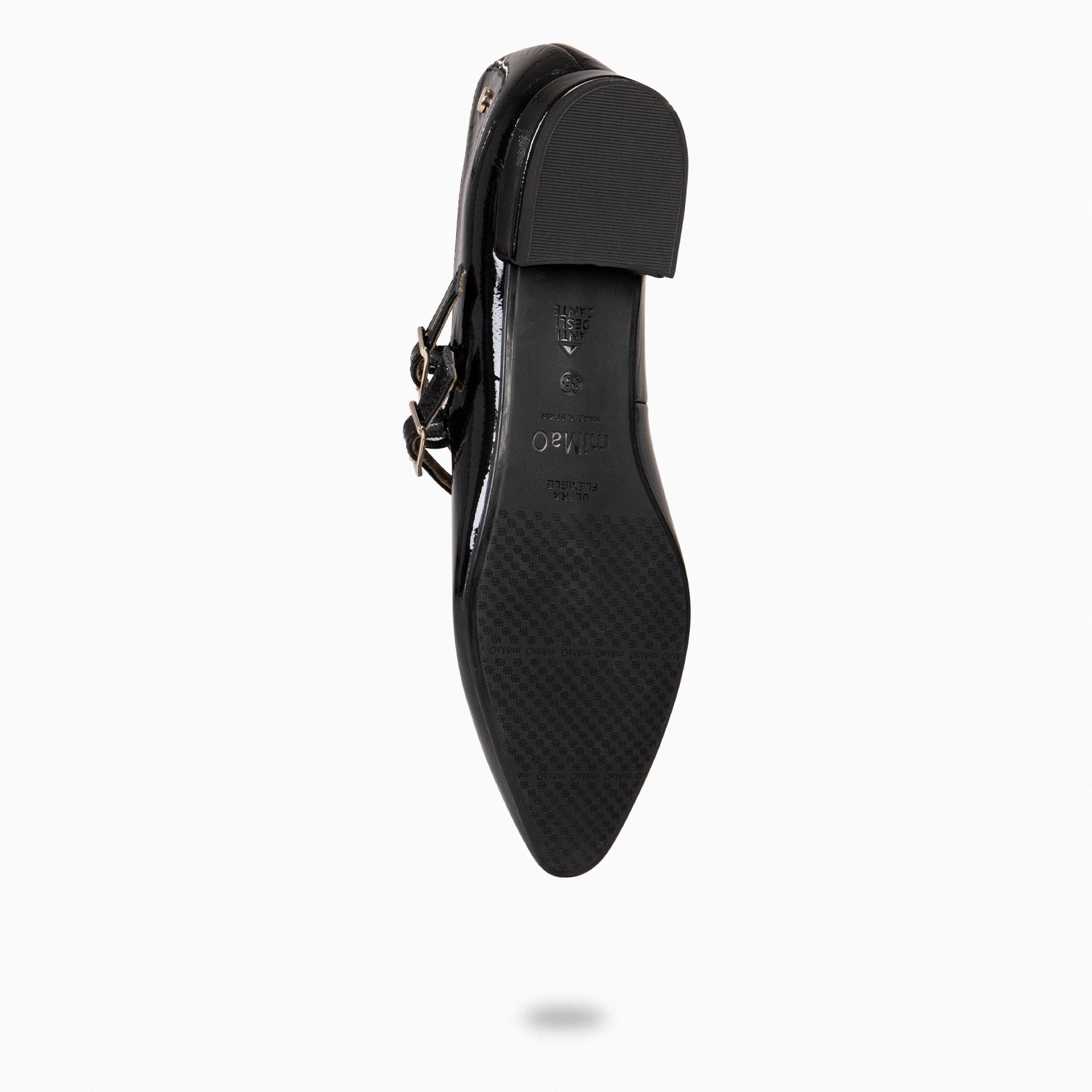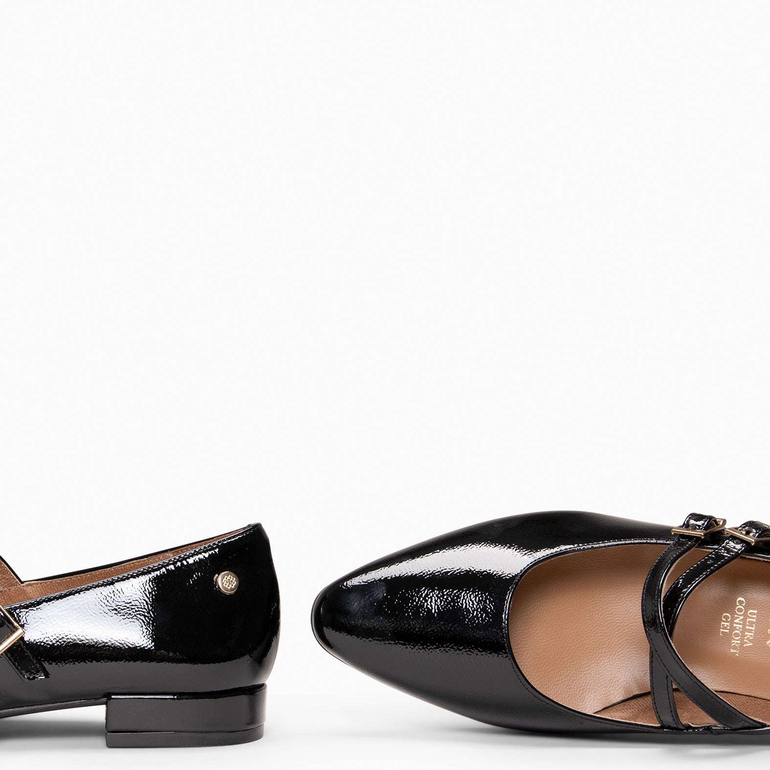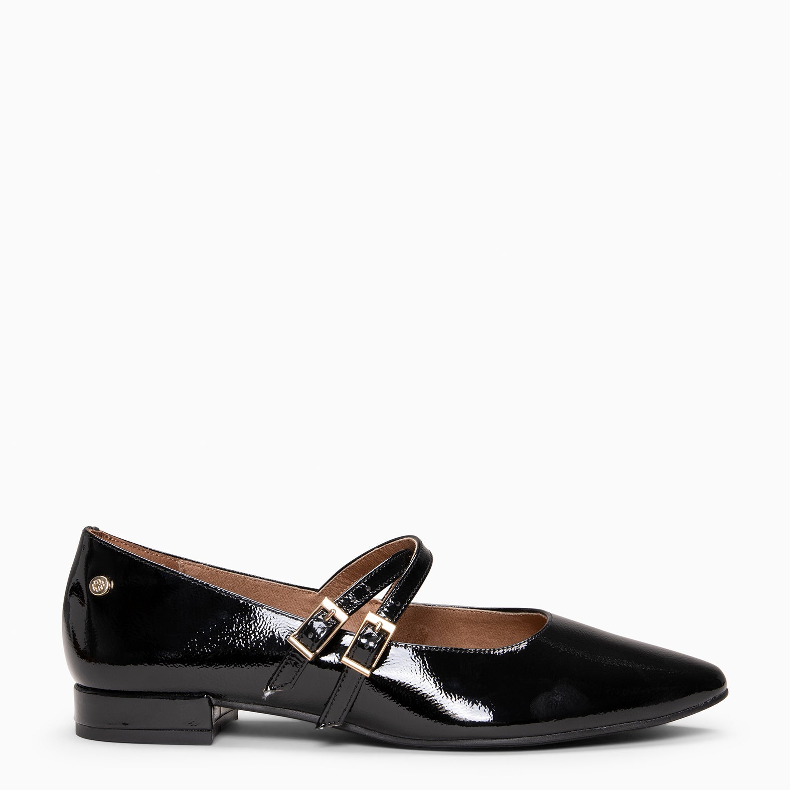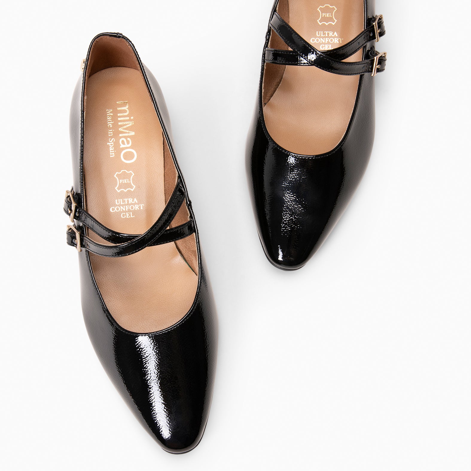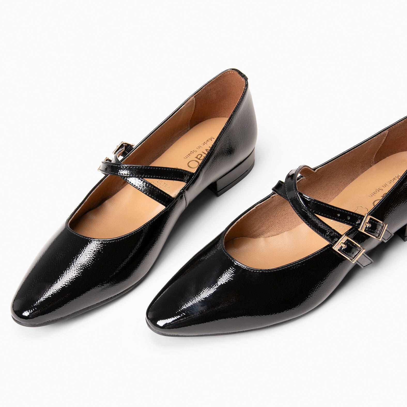 Añade un toque de glamour a tu calzado diario con estas merceditas de charol arrugado. El diseño incluye una pulsera doble con hebilla dorada, ajustable en cinco posiciones, que proporciona un ajuste seguro y estilizado. Tiene una altura de tacón de 2 cm, una altura perfecta para la comodidad del zapato.