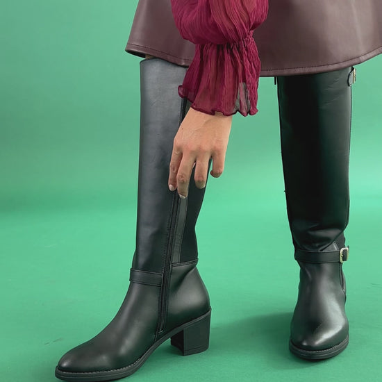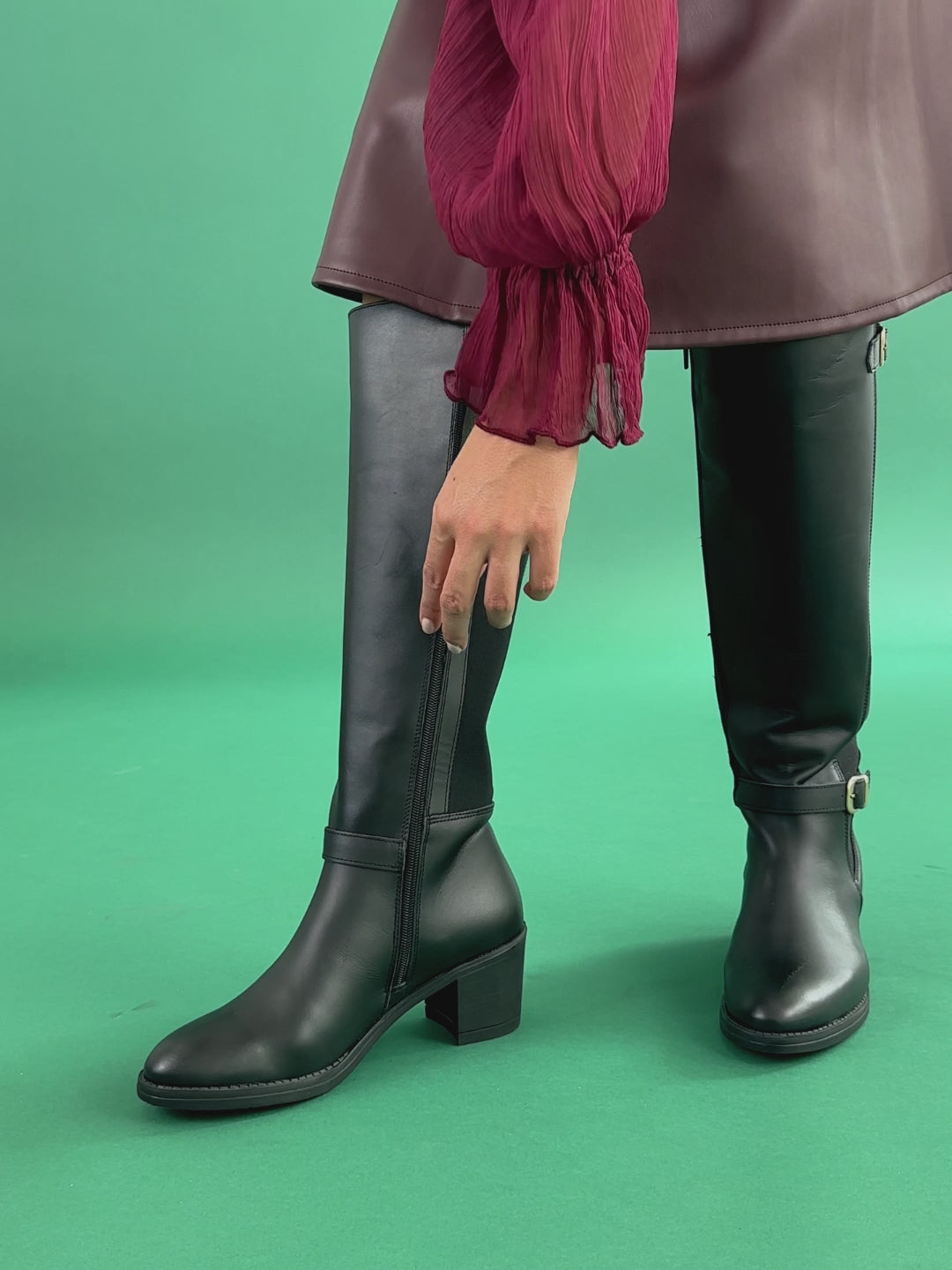 Botas de caña alta fabricadas en piel de napa ideales para usar durante los meses más fríos del año. Cuentan con una pulsera con hebilla que otorga un acabado elegante y, junto a su elasticidad, permite ajustarla perfectamente a la pierna.