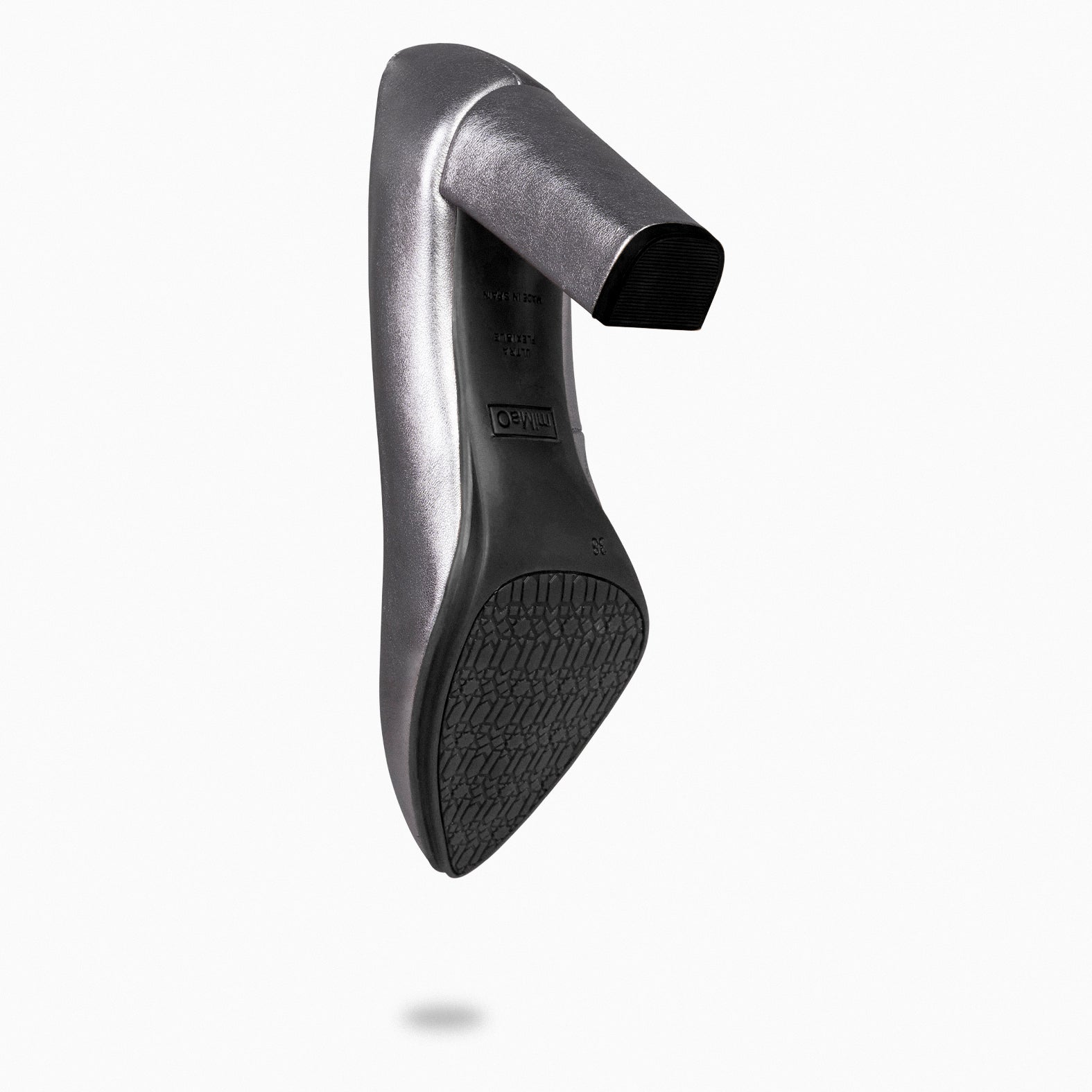 Zapatos de tacón con un acabado metalizado perfecto para completar tu armario con una línea de tonos metálicos. Son ideales para usar en ocasiones especiales gracias a su altura de 8,5 cm, pensada para estilizar la pierna. El tacón del zapato es alto (8,5 cm) pero su base es ancha y garantiza estabilidad. El diseño de la puntera recoge los dedos y el forro interior es muy suave.